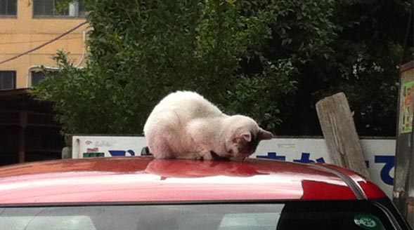 先日、赤い車の屋根の上で、うたた寝をしている猫を見つけました。