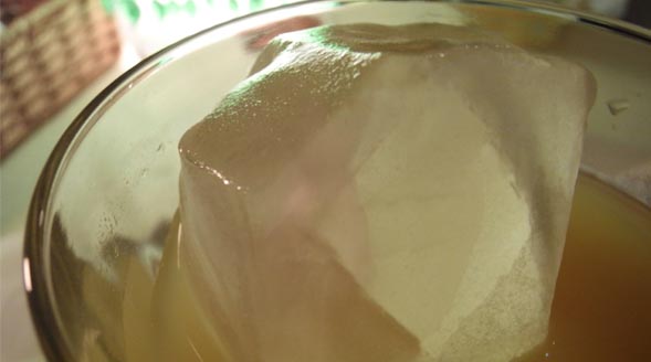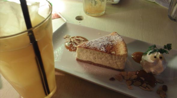 キャラメルソースのチーズケーキと氷山のような氷の入ったマンゴージュース。