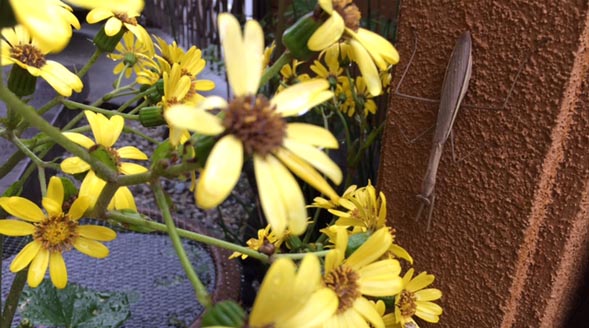 よく見ると、そんな虫達をねらったカマキリが、いつの間にか住み着きました。