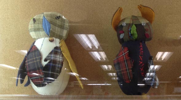 ↓生地の模様の部分を切って貼付けて目にしているフクロウ。目に見えるなぁ。
