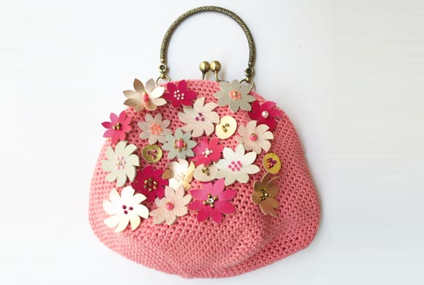 すこしサーモンがかった、やさしいピンク色のプチバッグにしてみました。