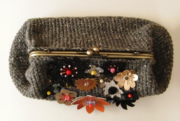 本体は、チャコールグレイの毛糸を編んで仕上げてあります。