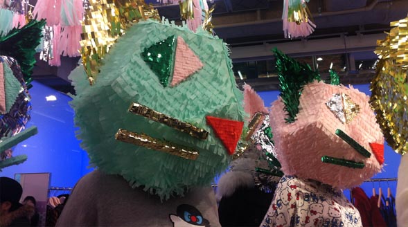アーティストとコラボレーションした店内では、きらきらした紙で装飾され、マネキンも猫のマスクをかぶっていました。