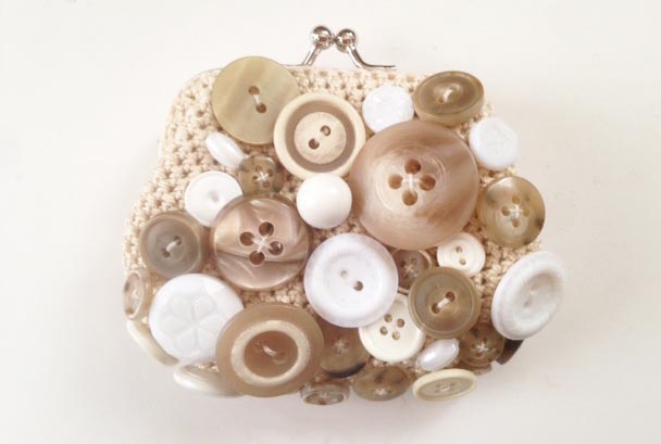 ↓白いボタンをたくさん刺繍したがまぐちです。