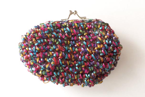 ↓そんなキラキラレインボウな紐を編んだがまぐちです。