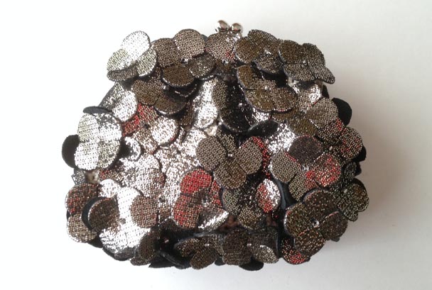 ぎらぎら輝くお花のコサージュが、がまぐち全体を覆ったデザインになっております。