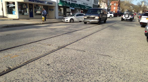 道路の真中には昔チンチン電車が通っていた残りが…。