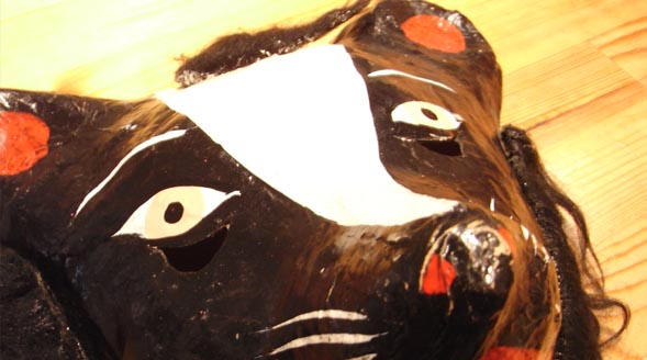 しかし、お面のデザインを重視してしまったためか、穴が下過ぎて、メンチ切ったような感じで、穴から外の世界を覗きます。