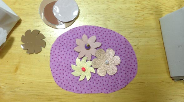 丸く切った生地に、色々施すのですが、私は花の革を刺繍することにしました。