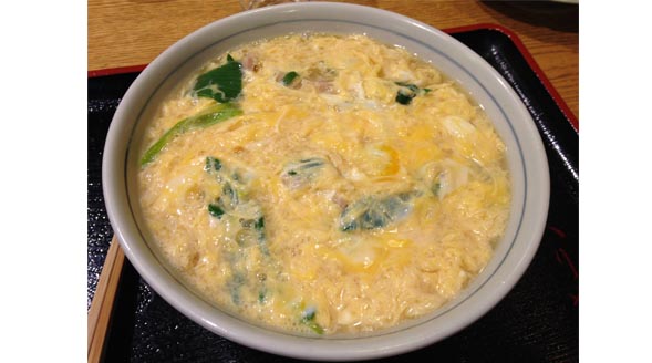 たっぷり溶き卵の中に、鶏肉と九条ネギ。