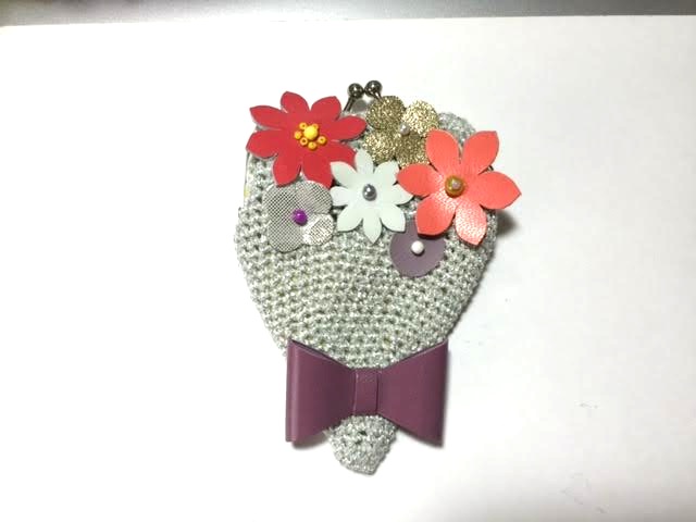 ムラサキ色のリボンをつけた、花束のがまぐちです。