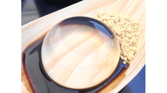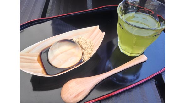 「水信玄餅」というネーミングですが、寒天に近く、30分で消えてなくなるらしく、店舗のお茶コーナーのみで食べられます。