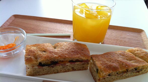 どこかの高原の豚ベーコンと、野菜のグリルを、こだわりのパンで挟んだサンドイッチ。